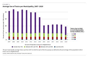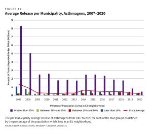 - From 2007 to 2020, the average use of Toxics per municipality was greatest in those with 75% or more of their population living in EJ Neighborhoods.