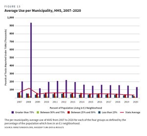 Under TURA, certain substances can be designated as Higher Hazard Substances (HHS). The HHS list includes many halogenated solvents, toxic metals, and other substances associated with adverse health effects, including cancer. As illustrated in Figure 13, average HHS use and release per municipality have been consistently higher in municipalities with 75% or more of the population living in EJ Neighborhoods. In these municipalities, the average use of HHS has decreased by around 25% since 2007.