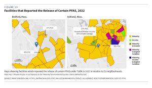 2022 was the first year in which reporting on the use of a new PFAS category17 was required under TURA. Six facilities reported using PFAS covered in the TURA category. The two facilities which reported releases of these PFAS are shown in relation to EJ Neighborhoods in Figure 15. These were reported as point air and fugitive air emissions. Air emission and exposure of PFAS from manufacturing sources is not as well studied as PFAS in drinking water.
