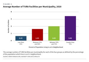 - In 2020, the average use and release of Toxics, number of TURA facilities and the quantity of chemicals shipped were all highest for the group of municipalities with 75% or more of the population living in EJ Neighborhoods. This suggests that those living in EJ Neighborhoods may continue to face comparatively greater risk of negative health outcomes due to Toxics use and release.